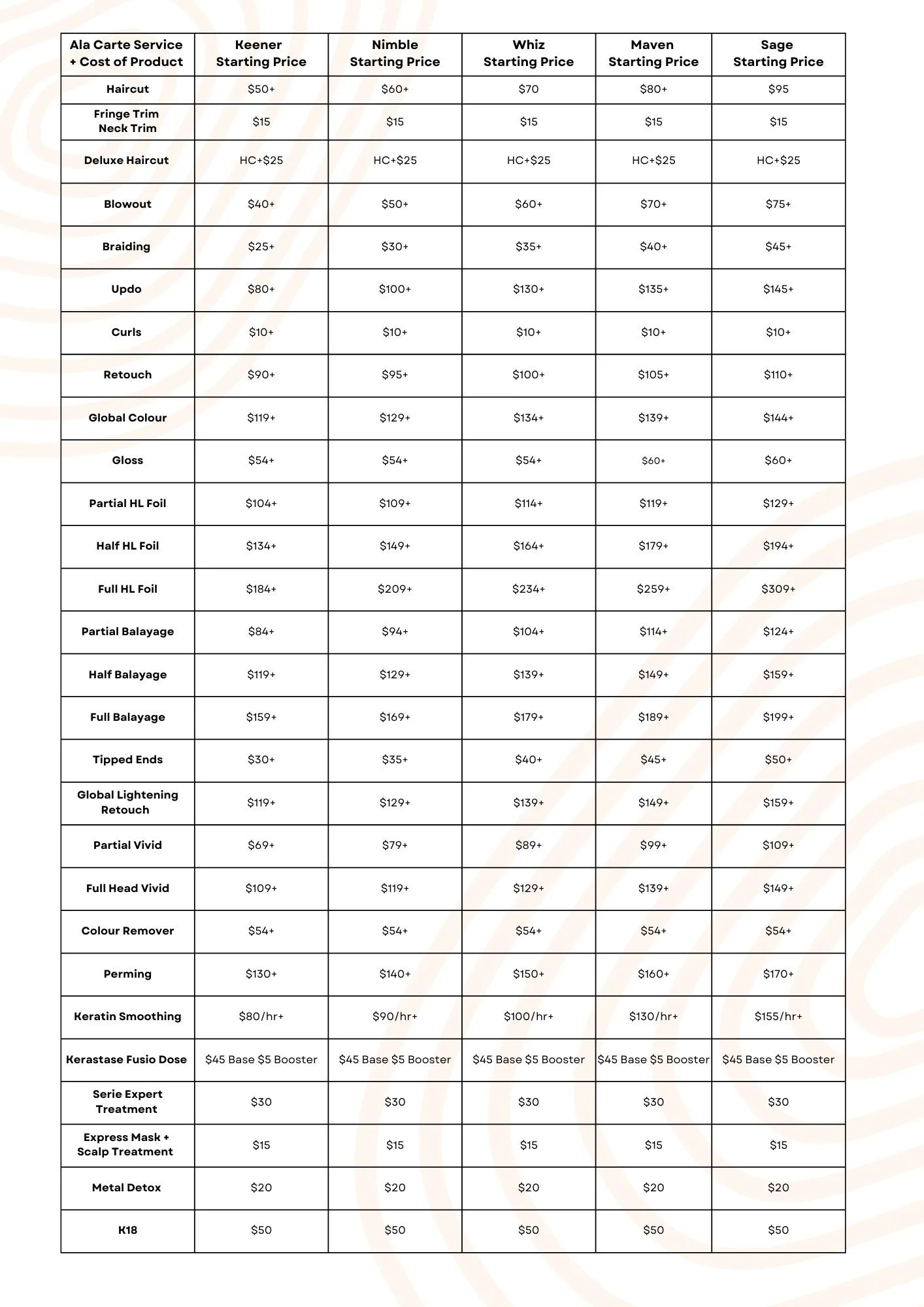 The pricing below is provided as a guide with “starting at” prices. For a more accurate estimate of cost, please call us to book a complimentary consultation with one of our stylists.